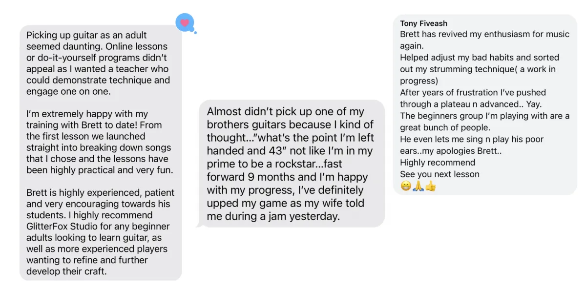 Lessons run for 48 weeks of the year - we have a two week break mid year and a two week break over Christmas. This is designed to ensure you're picking up your guitar consistently over a year to make the most amount of progress.